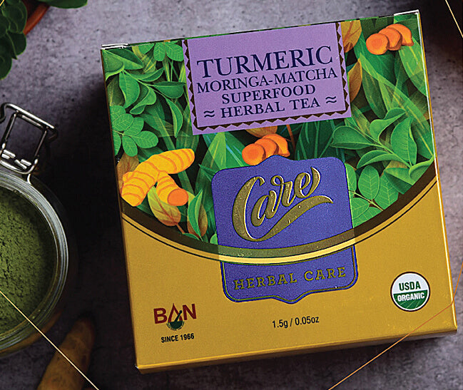 A powerful blend that combines three celebrated superfoods: turmeric, moringa, and matcha. This herbal tea is rich in vitamins, minerals, and phytonutrients, making it a nourishing addition to your daily wellness routine. Each ingredient has been trusted for its health benefits throughout history.